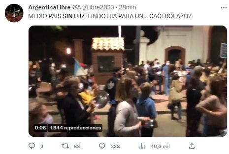 "Un día sos campeón del mundo, al otro ganas 4 CUATRO The Best y al otro se queda sin luz todo el país con 35º de térmica, Dios te da y te quita", comentaba alguien en Twitter unos minutos después de que se confirmara el alcance nacional del apagón. Alguien más comentaba: "Bajó la tensión y volvió. Medio país sin luz porque se cayó Atucha I. Dios ya no sabe cómo pedirte que no votes peronismo".