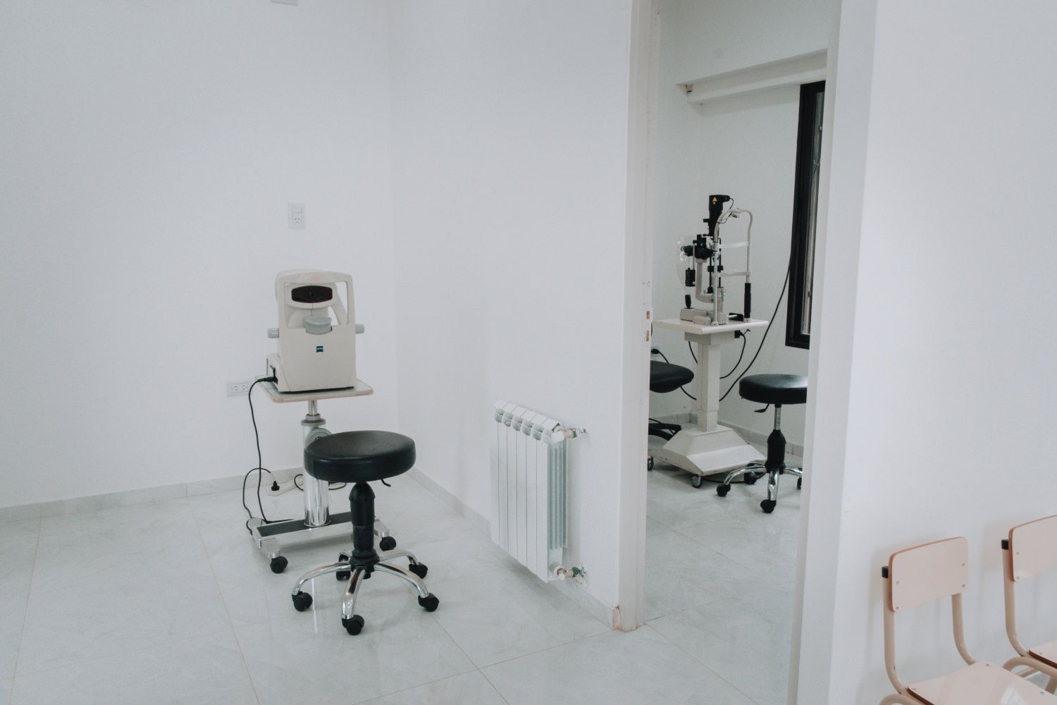 El Centro de Atención Oftalmológico está compuesto por una sala de atención y espera, un sanitario de uso público, sanitario y oficina para el personal y un consultorio privado de atención.