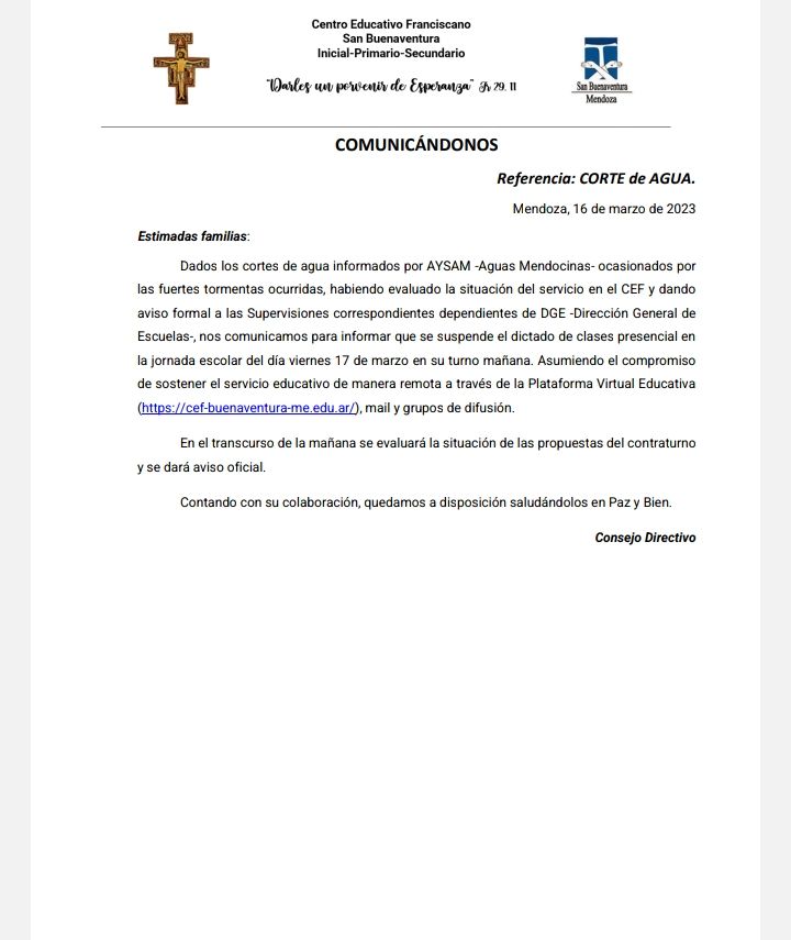 Por su parte, el colegio San Buenaventura fue uno de los pocos que comunicó a su alumnado que no habrá clases este viernes, pero al menos en el turno mañana. Sin embargo, destacan que habrá comunicación "remota" con los estudiantes a través de una plataforma digital.
