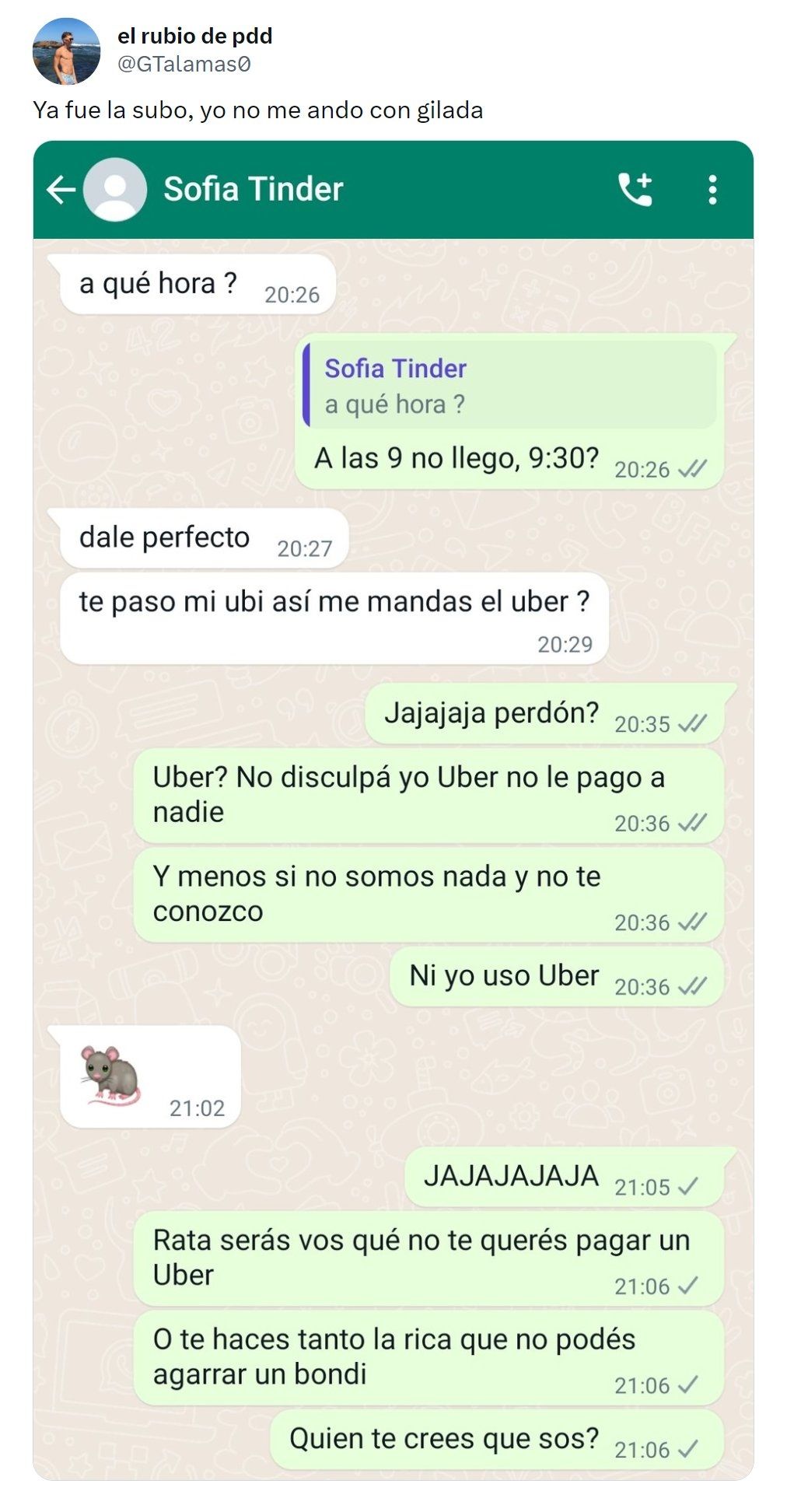 "¿Uber? No, disculpá. Yo no le pago el Uber a nadie", le respondió él y continuó diciéndole: "Menos si no somos nada y no te conozco. Ni yo uso Uber", le explicó. Ella le respondió con un emoji de una rata y lo bloqueó.