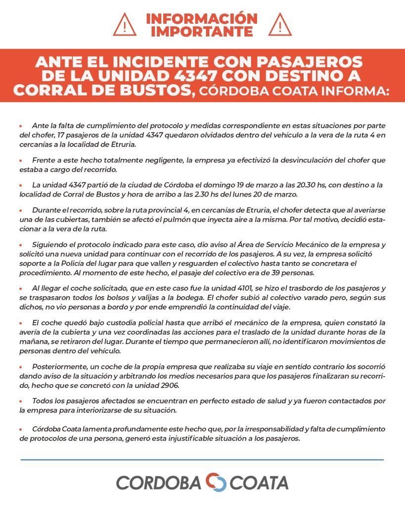 Si bien aclararon que todos los pasajeros afectados se encontraban en perfecto estado de salud y fueron contactados por la empresa para interiorizarse de su situación. “Frente a este hecho totalmente negligente, la empresa ya efectivizó la desvinculación del chofer que estaba a cargo del recorrido”, informó Córdoba-Coata.
