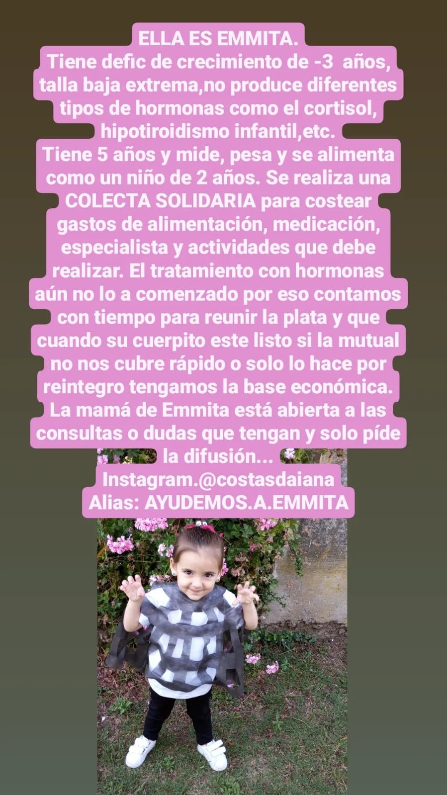 Agrega que desde octubre, cuando recibieron el diagnóstico, Emma está en tratamiento con nutricionista "para alcanzar un peso razonable y poder hacer estudios para saber el grado de hormonas que va a precisar. Emma hoy pesa 12 kilos, tiene que llegar a los 15 para poder hacerse estudios de alta complejidad", dice y sigue: "A partir de ahí vamos a saber qué hormonas se debe inyectar y empezar el tratamiento que en algunos chicos dura 10 años, en otros 5... Ella no produce cortisol, que es otra hormona que -dicho en criollo- humecta los órganos y tiene un hipotiroidismo infantil", explica Daiana.
