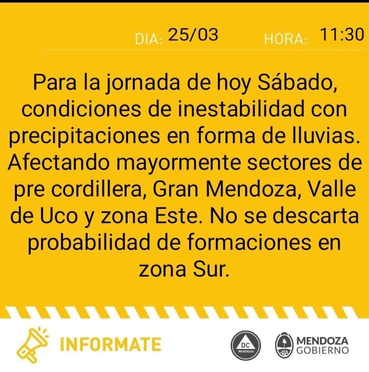 "Precipitaciones: La presencia de altos índices de humedad, mantiene las condiciones de cielo cubierto o semi cubierto, con posibilidad de precipitaciones aisladas débiles, mayormente en zona Este, zona Oeste de Valle de Uco. Posteriormente la nubosidad se extendería sobre Valle de Uco y Gran Mendoza, a partir de las 14:00 horas, con precipitaciones", argumentaron desde Defensa Civil este sábado.