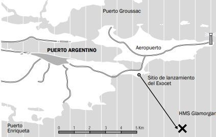posición del HMS Glamorgan a las 2 am del 12 de junio, y la trayectoria del misil)