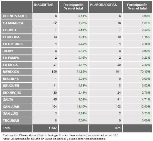En tanto, en Mendoza hay 896 anotadas, de las cuales 611 son elaboradoras. Estas últimas representan el 70,15% del total nacional.