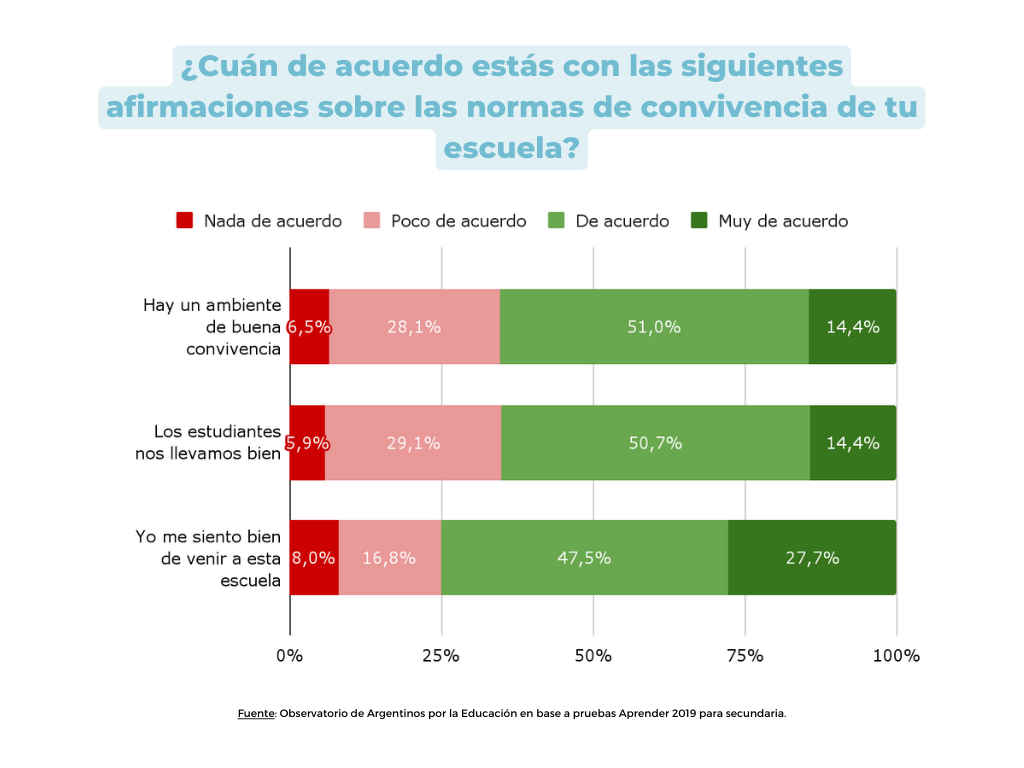El 65,4% de los estudiantes considera que hay un buen ambiente de convivencia en su escuela, mientras que el 28,1% está “poco de acuerdo” con esa afirmación y un 6,5% “nada de acuerdo”. En otras palabras, el 34,6% registra un clima de mala convivencia en la institución a la que asiste.