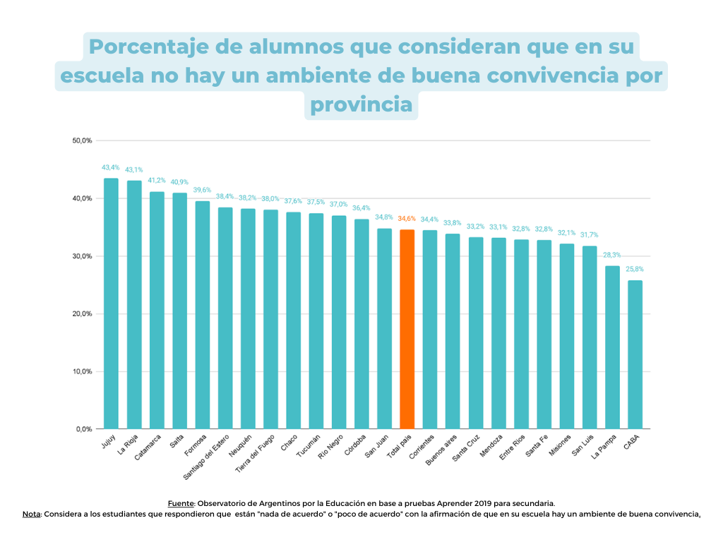 Si, además, se desagrega el dato por provincia, veremos que la diferencia es amplia: mientras que en Jujuy el 43,8% afirma asistir a una escuela donde prima la mala convivencia, en CABA sólo lo hace el 25,8%.