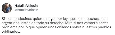 “Si los mendocinos quieren negar por ley que los mapuches sean argentinos, están en todo su derecho. Mirá si nos vamos a hacer problema por lo que opinen unos chilenos sobre nuestros pueblos originarios”, expresó Volosin, quien en su descripción asegura ser “Master y Doctora en Derecho Universidad de Yale”.