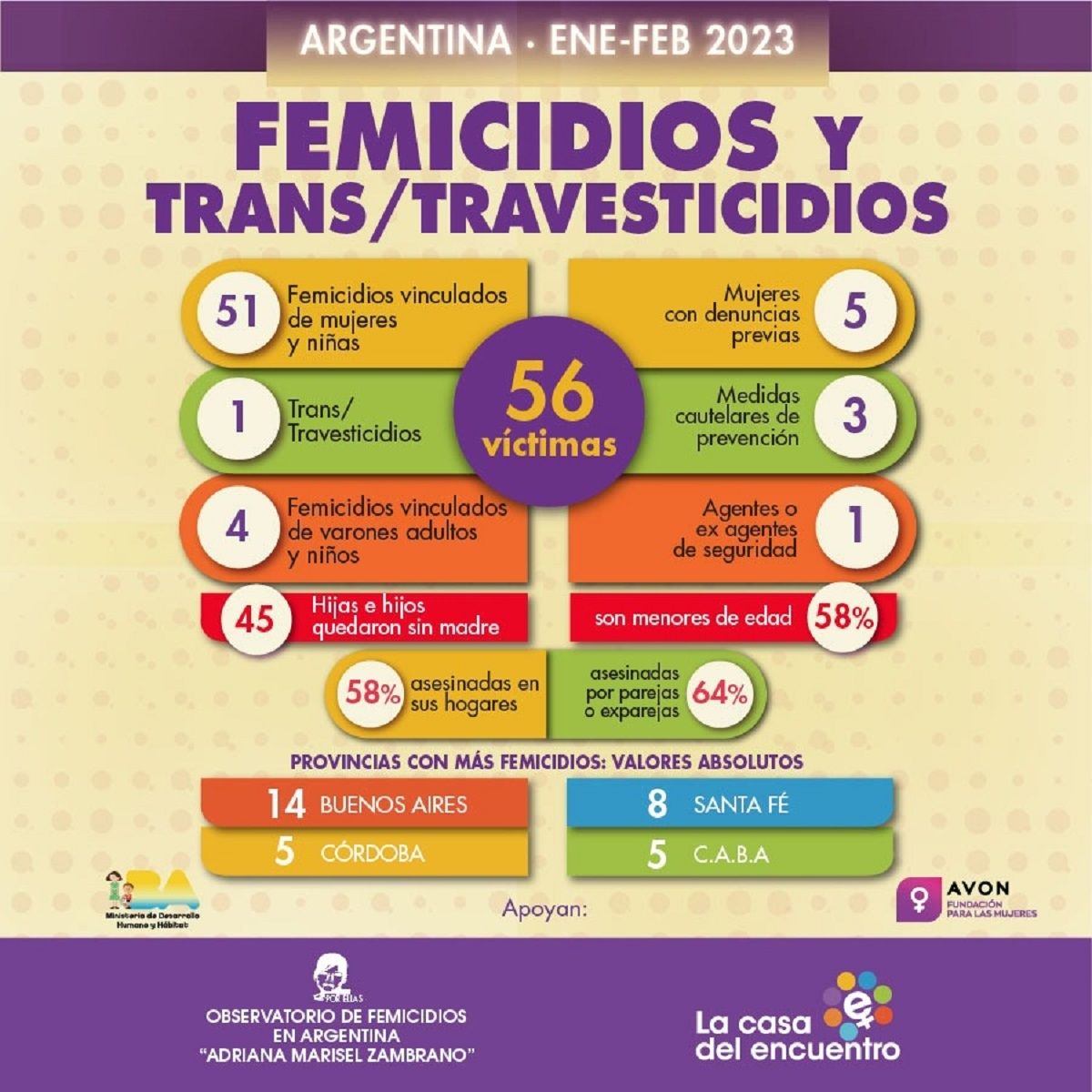 Así, en vísperas del Día Internacional de la Mujer, la realidad llama a reflexionar y repensar prácticas que desde lo cotidiano socavan derechos y apagan vidas. Solo si se tienen en cuenta los datos en lo que va de este año, es posible advertir el impacto de los femicidios que se siguen cobrando vidas de mujeres a nivel nacional, pero que, además, pesan sobre la vida y el porvenir de cientos de niños y niñas que se quedan sin su madre y con las marcas del maltrato y la violencia en su alma. Solo en el período que va del 1 de enero al 28 de febrero de 2023, en el país se produjeron 51 femicidios. A esta preocupante lista se suma un trans/travesticidio y cuatro femicidios vinculados de varones, según un nuevo informe del Observatorio de Femicidios en Argentina “Adriana Marisel Zambrano”, que dirige La Casa del Encuentro.