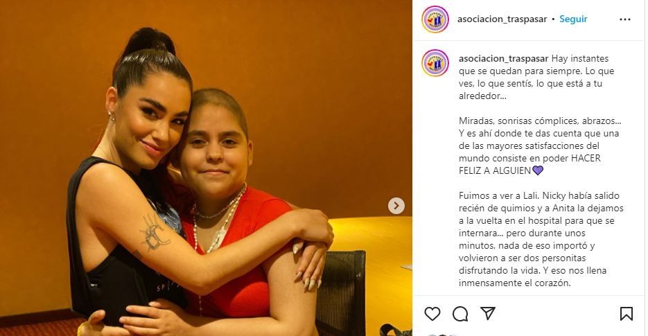 "Fuimos a ver a Lali. Nicky había salido recién de quimio y a Anita la dejamos a la vuelta en el hospital para que se internara... pero durante unos minutos, nada de eso importó y volvieron a ser dos personitas disfrutando la vida. Y eso nos llena inmensamente el corazón", contaron sobre el encuentro con la cantante.