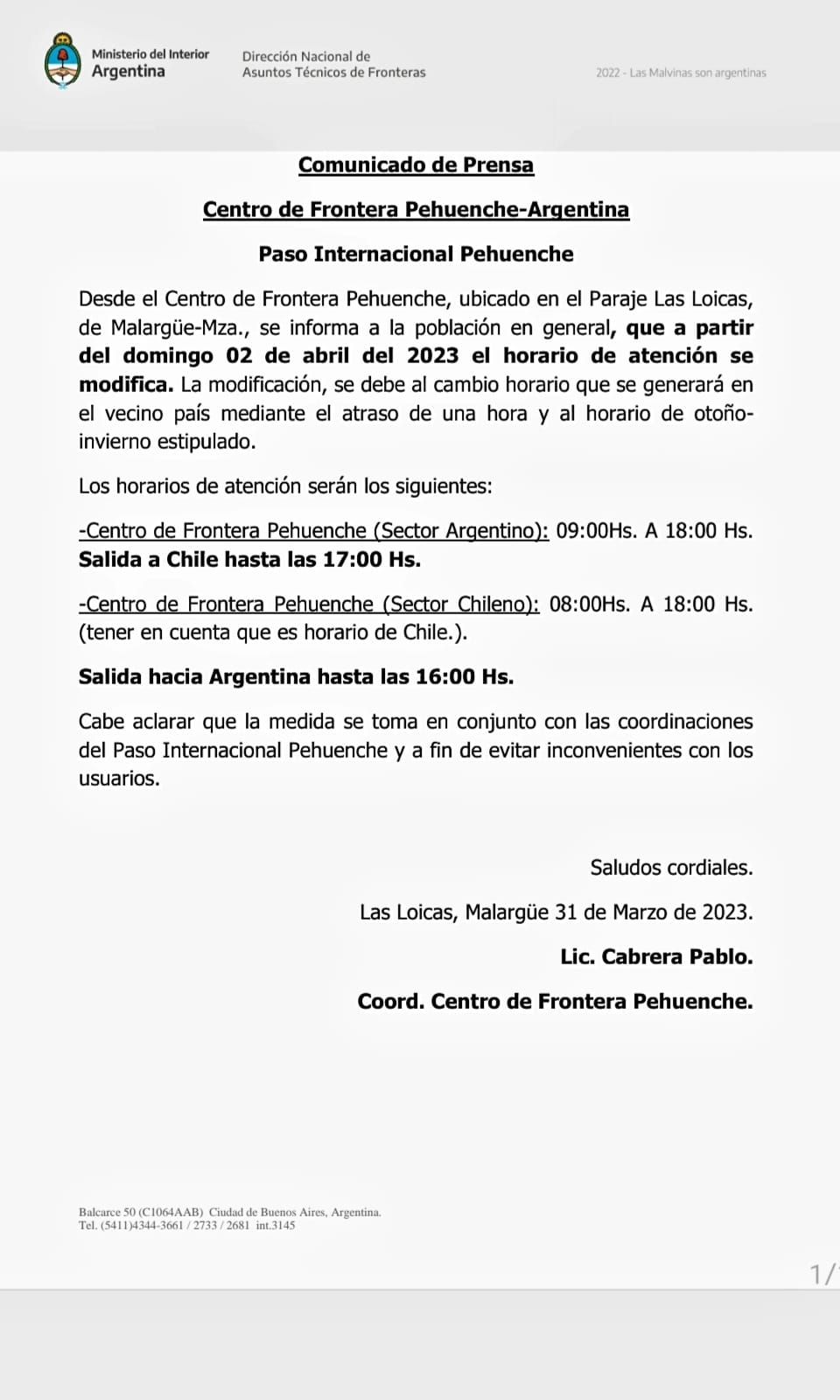 "Desde el centro de Frontera Pehuenche, ubicado en el paraje Las Loicas de Malargüe, Mendoza, se informa a la población en general que a partir del domingo 2 de abril de 2023 el horario de atención se modificará", informaron desde la frontera este sábado por la mañana.