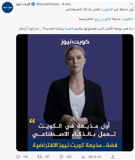 "Soy Fedha, la primera presentadora en Kuwait que trabaja con inteligencia artificial en Kuwait News. ¿Qué tipo de actualidad prefiere? Escuchemos sus opiniones", dice la blonda en árabe. El tuit a través del cuál el medio dio a conocer a su nueva presentadora, recibió cientos de respuestas y no tardó en viralizarse.