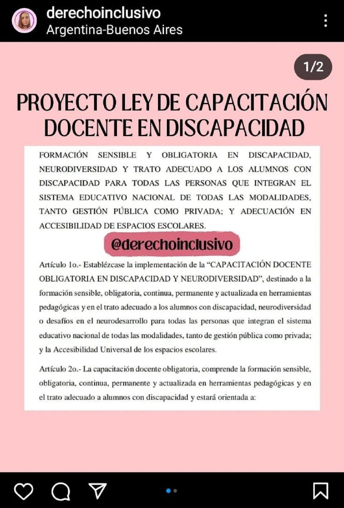A nivel Nacional, diferentes entidades, familiares de niños y niñas con discapacidad y profesionales están apoyando y defendiendo un proyecto de Ley que recientemente ingresó a la Cámara de Senadores con el que se busca que la capacitación en discapacidad destinada a docentes sea una realidad en el país. El objetivo, de esa iniciativa se centra, justamente, en lograr afianzar la capacidad del personal que trabaja en escuelas, de manera que sea posible, por ejemplo, que los/las educadores y directivos cuenten un herramientas más actualizadas a la hora de intervenir en situaciones específicas que se pueden plantear dentro de las aulas.