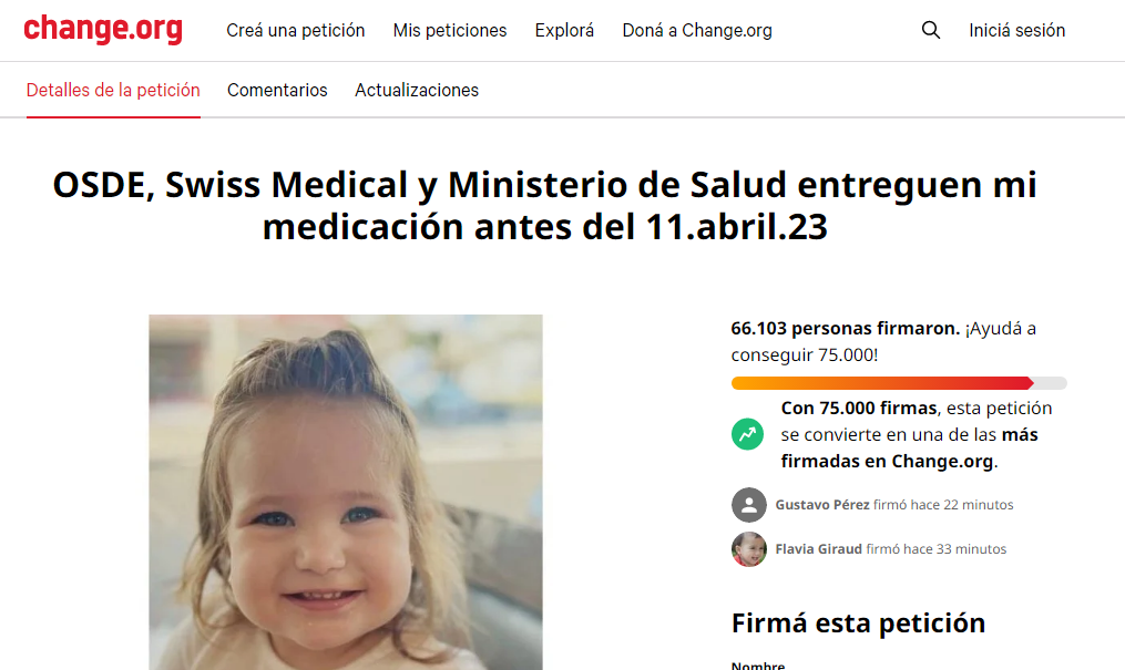 Mientras tanto, la familia comenzó a juntar firmas en la plataforma change.org para que "OSDE, Swiss Medical y Ministerio de Salud entreguen la medicación".