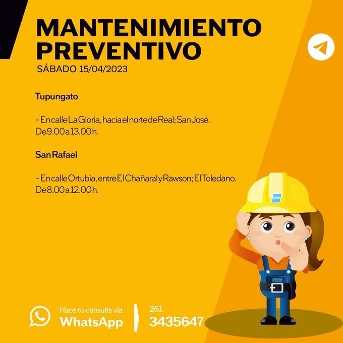 -Malargüe: en todo el departamento por tareas de Mantenimiento Anual en Línea de Alta Tensión y en Estaciones Transformadoras. De 9.00 a 15.00 h.