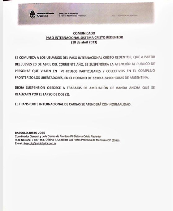 Quienes tengan pensado viajar a Chile en los próximos días a través del Paso Cristo Redentor deberán tener en cuenta un importante cambio que fue anunciado por las autoridades trasandinas. Es que, debido a la realización de obras comenzarán a suspender la atención a autos particulares y colectivos durante la noche.