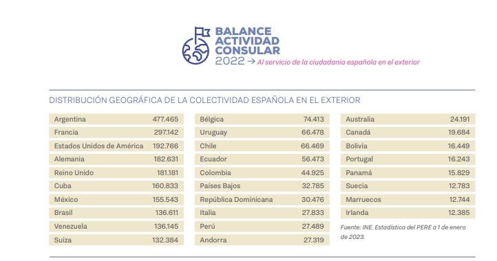 Según este mismo informe de actividad consular, en Argentina se encuentra una gran parte de la comunidad española que vive en el exterior y por eso no resultó novedoso que las oficinas consulares de las provincias se vieran con gran demanda desde ese entonces. En el país se distribuye, según el recuento unos 477.465 ciudadanos que forman parte de la colectividad española. Casi el 60% solamente se encuentra en Sudamérica. Argentina es, justamente, el país que más solicitó nacionalidades en los últimos meses.