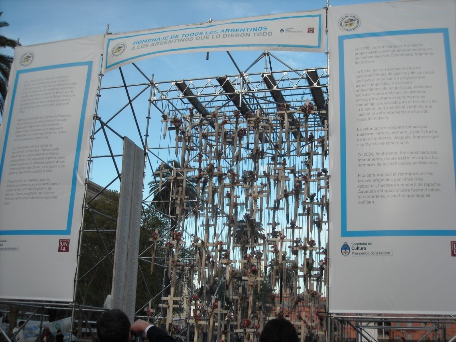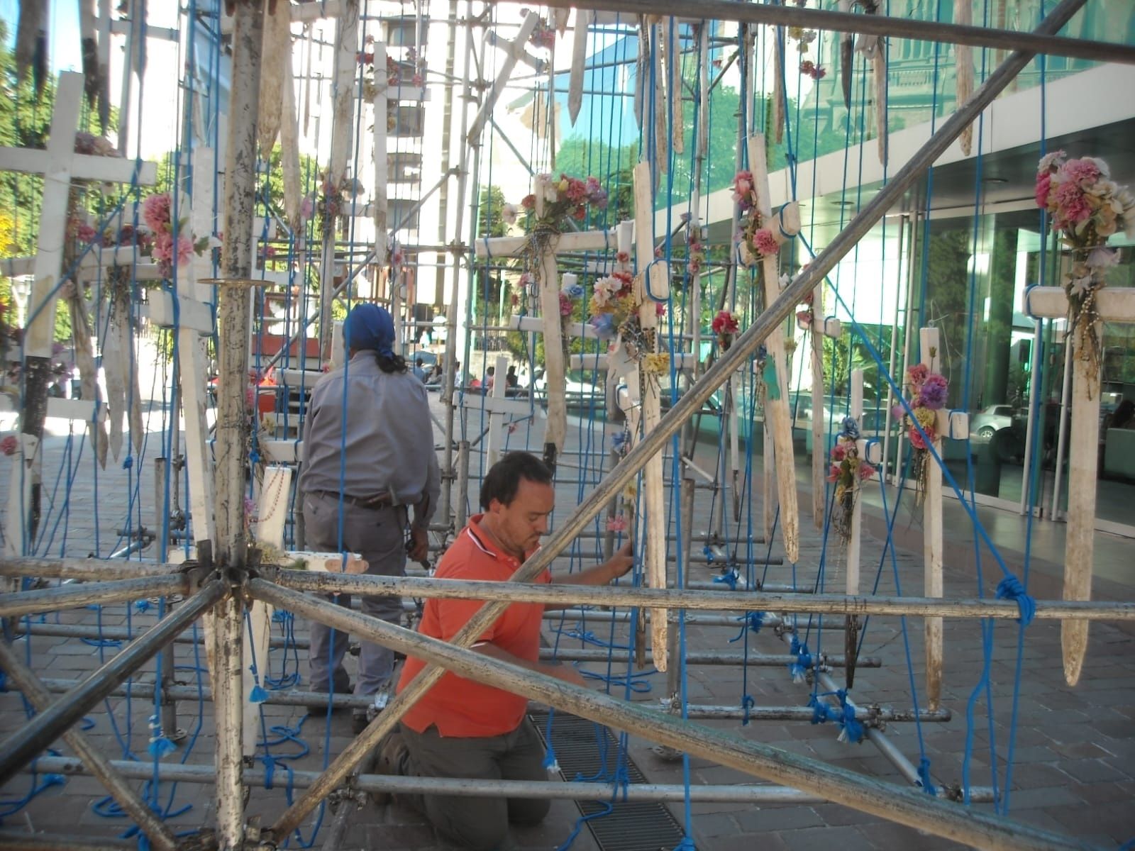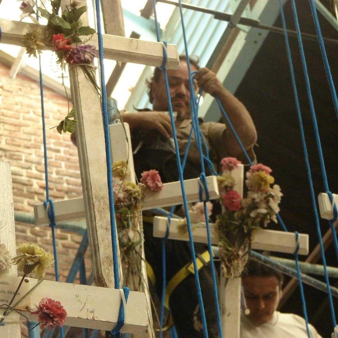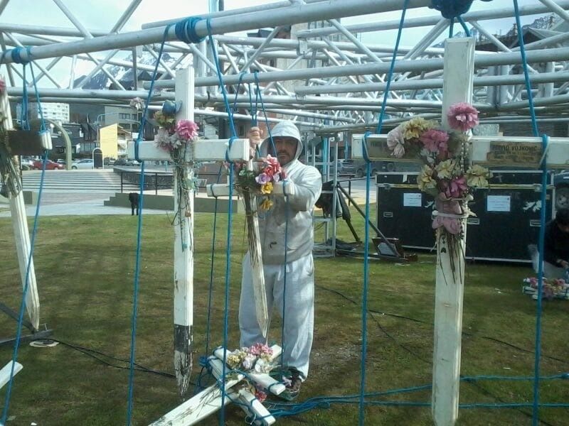 “Lo primero fue superar la impresión y tratar de entender cómo manejarnos con todo ese material. Lo conozco a Julio Cardoso, que era el director del Observatorio Malvinas en ese momento. Julio pensó un formato, que las cruces cuelguen del cielo. Compramos soga azul y atamos los brazos de las cruces e hicimos un montaje”, relató Daniel.