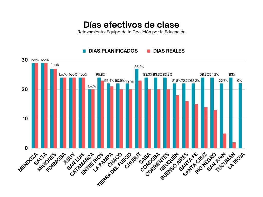 Hace unos días se dieron a conocer los datos del mes de marzo. De acuerdo con lo relevado, solamente en cinco provincias hubo clases todos los días previstos: Mendoza, Salta, Misiones, Formosa, Jujuy, San Luis y Catamarca. En el otro extremo, en la provincia de La Rioja no hubo ni un día de clases, en Tucumán apenas dos y en San Juan cinco.