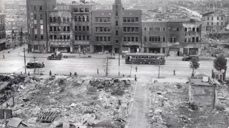 "Aquí vale la pena recordar la campaña de bombardeos incendiarios que arrasó las construcciones en gran parte de madera de Japón en los últimos meses de la Segunda Guerra Mundial".