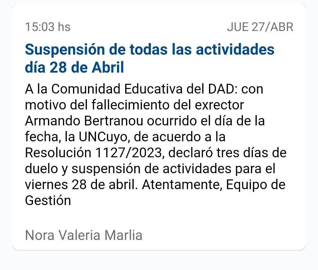 Además, se dispuso "asueto para el día viernes veintiocho (28) de abril de 2023, declarando la inhabilidad administrativa, a fin de posibilitar al personal y estudiantes la concurrencia al velatorio que se llevará a cabo en el Cilindro Central del Centro de Información y Comunicación de la Universidad Nacional de Cuyo (CICUNC) de 9 a 14 horas, como así también a las exequias de sus restos”.