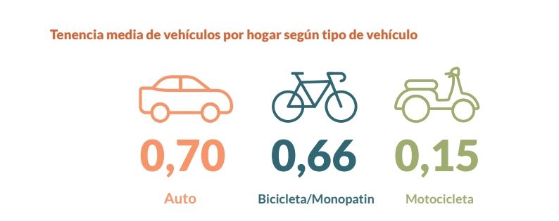 La encuesta arroja resultados que permiten caracterizar los principales recursos de movilidad que poseen los hogares. "En cuanto a la tenencia de vehículos motorizados en funcionamiento, existen en promedio 0,70 automóviles por hogar. Si contemplamos sólo a los hogares que poseen al menos 1 vehículo encontramos que el promedio de automóviles por hogar es de 1,20. La tenencia media de motos/motocicletas es mucho menor, con un promedio de 0,15 por hogar. Cabe destacar el valor alcanzado en bicicletas, que se acerca a la tenencia media de vehículos automotores: en el área de estudio existen en promedio 0,66 bicicletas por hogar", sostiene la encuesta.