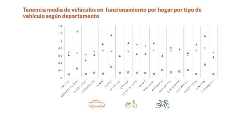 Al analizar los recursos de movilidad de los hogares por departamento, encontramos que Luján de Cuyo y Maipú son los departamentos que presentan mayor tenencia media de automotores (0,90 y 0,86 respectivamente). Rivadavia presenta el valor más bajo con 0,58. Un dato relevante para la promoción de la movilidad sustentable, es que la tenencia media de bicicletas presenta diferencias significativas por departamento. General Alvear, La Paz y Tunuyán presentan los promedios más altos (1,26, 1,16 y 1,14 bicicletas por hogar respectivamente). La tenencia media de bicicletas en los departamentos del Gran Mendoza se encuentra en valores cercanos al promedio general.