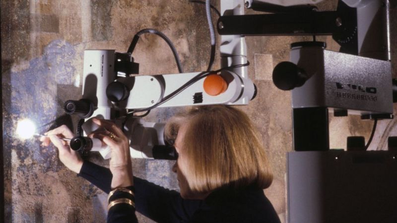 Después de sellar inicialmente la sala para evitar la entrada de más polvo y suciedad, y tras montar enormes andamios frente al fresco, la restauradora y un pequeño grupo de asistentes hicieron pequeños agujeros en la pared para insertar cámaras diminutas y establecer cuántas capas de pintura cubrían la obra original.