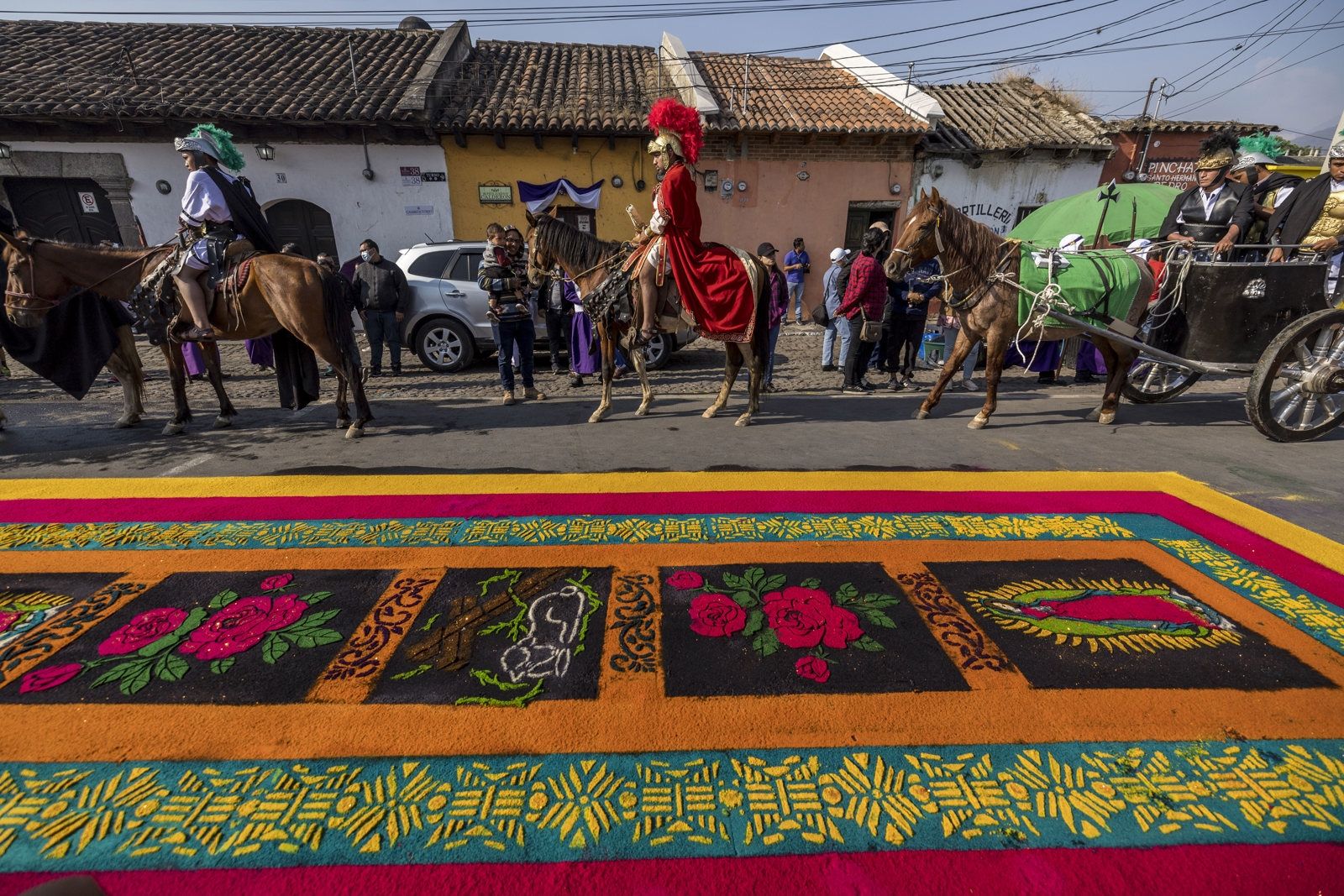 Antigua, en Guatemala, es un lugar mágico durante el mes de abril, cuando comienzan los preparativos para celebrar la Pascua. Pero es durante el Viernes Santo cuando la ciudad adquiere un ambiente especial y lleno de devoción. Desde tempranas horas de la mañana, los lugareños y turistas se reúnen en las calles para crear las impresionantes alfombras de flores y frutas que forman parte de la procesión y desfiles. Con destreza y creatividad, utilizan aserrín teñido de colores para la base y, sobre él, moldean figuras decoradas con flores frescas que representan su fe y amor por Jesucristo.