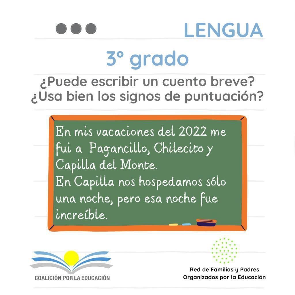 A fin de tercero deberían poder leer fluidamente un cuento breve y describir su contenido. También debería poder escribir uno de su autoría, hacer un resumen, y localizar información en un texto, entre otras habilidades.