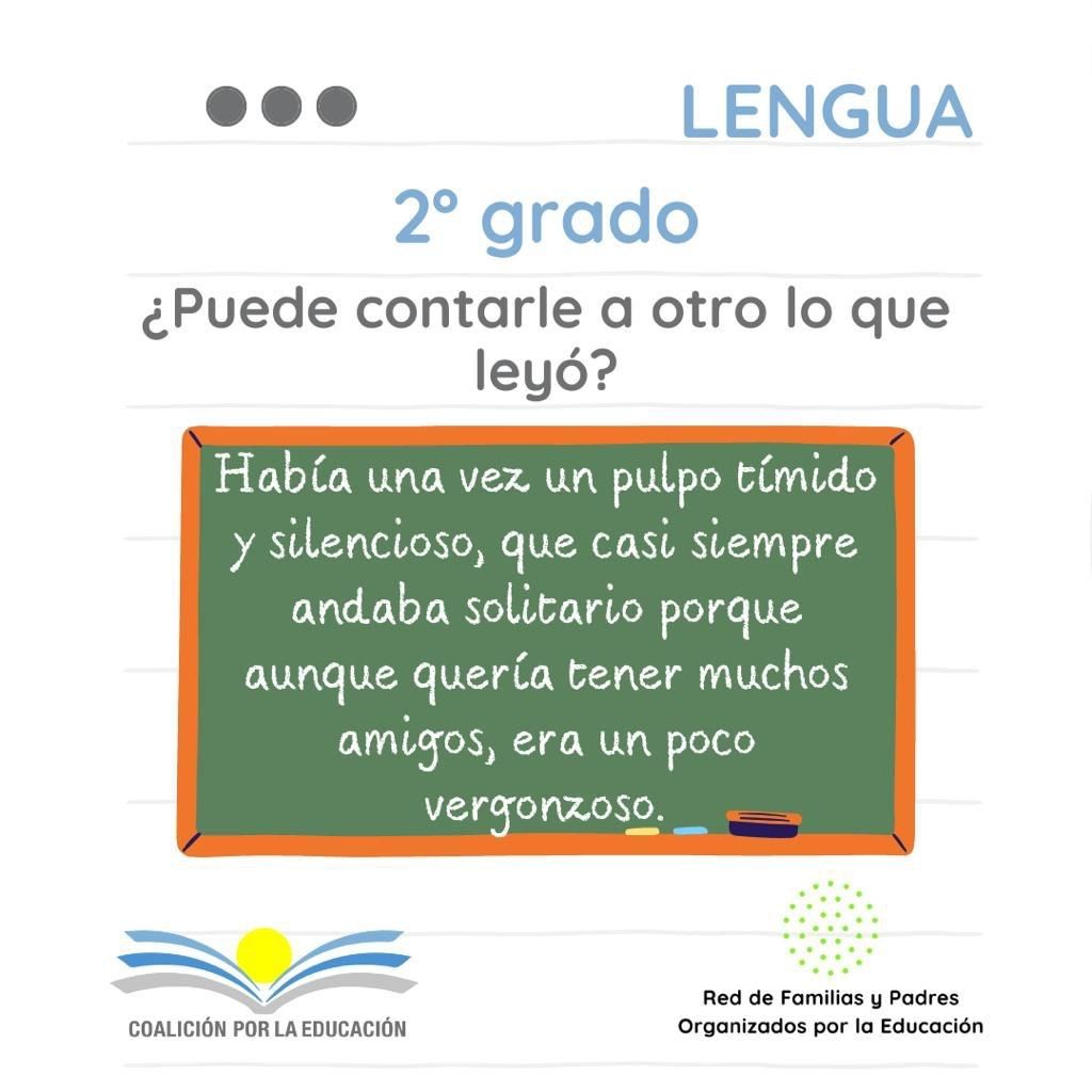Al finalizar segundo grado ya debe ser capaz de leer un texto breve con entonación, comprenderlo y contar lo que leyó. También escribir un texto breve a partir de una consigna y reconocer las partes de un cuento.