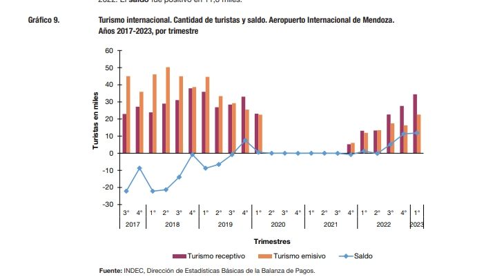 El informe arroja que "en el Aeropuerto Internacional de Mendoza, se estimaron 34,4 miles de llegadas de turistas no residentes, con un aumento de 161,6% con relación al primer trimestre de 2022", lo que muestra un enorme crecimiento del turismo en la provincia, teniendo en cuenta que sólo se contabilizan los viajes en avión.