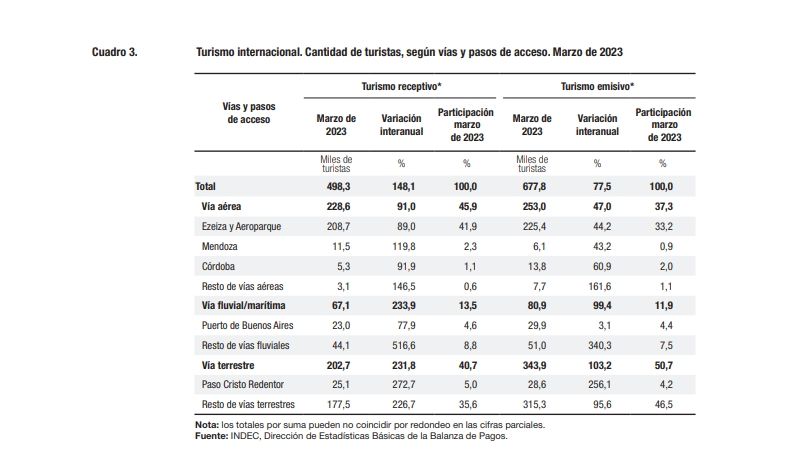 "En el Paso Internacional Cristo Redentor, se estimaron 87.300 llegadas de turistas no residentes, con un aumento de 364,2% respecto de igual período del año anterior", informó el Indec en su último reporte respecto del turismo que Mendoza recibe. Además, desde enero a marzo se registraron 194.200 salidas al exterior de turistas residentes, con un incremento de 961,6% interanual, dato que sorprende aún más ya que demuestra que el mendocino sigue viajando a Chile de forma masiva, aunque no a realizar compras en supermercados, sino simplemente a pasar unos días de "vacaciones u ocio" y volver. Un factor que explica esto es la flexibilización paulatina de las restricciones de coronavirus, teniendo en enero un pico máximo de viajantes.