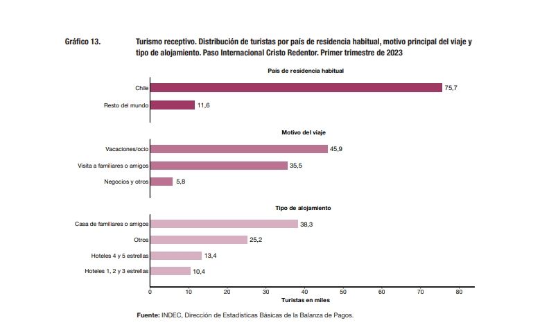 A través del Paso Internacional Cristo Redentor se registró el ingreso de 87.300 turistas no residentes, de los cuales 86,7% fueron de residencia chilena. El 52,6% de los turistas no residentes indicaron que el principal motivo del viaje fue “Vacaciones/ ocio”; le siguió la categoría “Visita a familiares o amigos”, con el 40,7% del total del turismo receptivo.