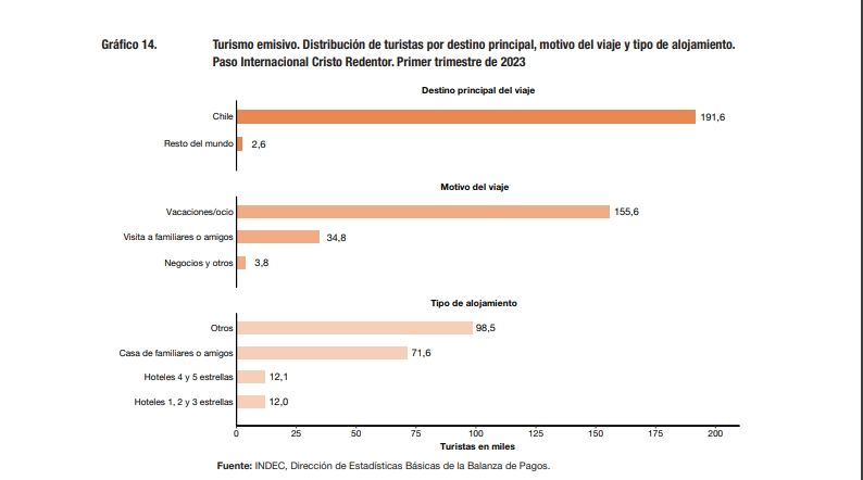 En cuanto al turismo emisivo, el 98,6% de los mendocinos que tenían que viajar en auto o micro eligió como destino principal Chile según Indec. Se alcanzó un total de 191.600 miles de turistas residentes. El principal motivo del viaje fue “Vacaciones/ocio”, con una participación de 80,1% y con un pico en enero/febrero.