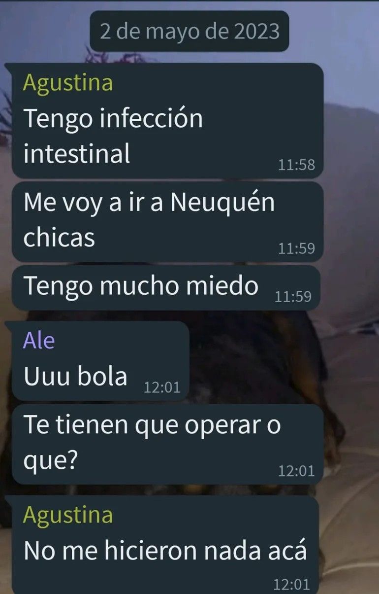 Las capturas fueron difundidas por el diario local LM Cipolletti. Por ejemplo, el 30 de abril una amiga le consultó qué le habían dicho los médicos del hospital local y Agustina le contestó: “No me dieron ni cinco de bolas, solo una pastilla para calmar el dolor”.