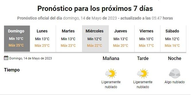 Para este domingo se espera una jornada cálida con una máxima de 25° y cielo ligeramente nublado.