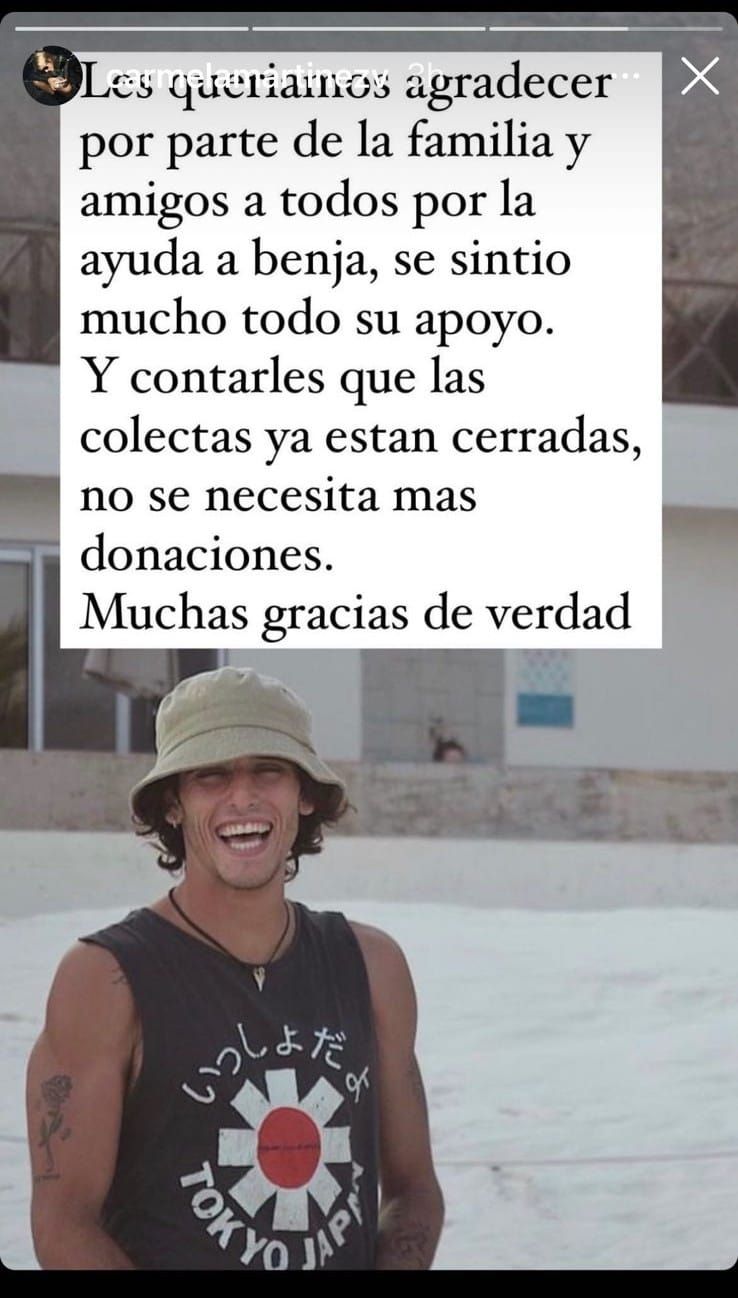"Les queríamos agradecer por parte de la familia y amigos a todos por la ayuda a Benja, se sintió mucho todo su apoyo. Y contarles que las colectas ya están cerradas, no se necesitan más donaciones. Muchas gracias de verdad", escribió la joven en su cuenta de Instagram.