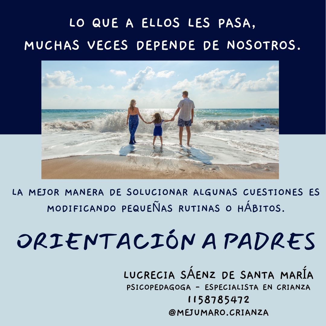 Luego de años de profesión, decidí abocarme a la orientación a padres justamente porque desde allí podemos construir y mejorar la realidad de los más pequeños. No siempre, pero la gran mayoría de las veces me encuentro que no es necesario un tratamiento con ellos sino con los padres. Ayudando a los padres, ayudándonos a nosotros mismos logramos grandes cambios. Tal vez no son grandes cuestiones, sino simplemente cambio de ciertas rutinas, hábitos, conductas.