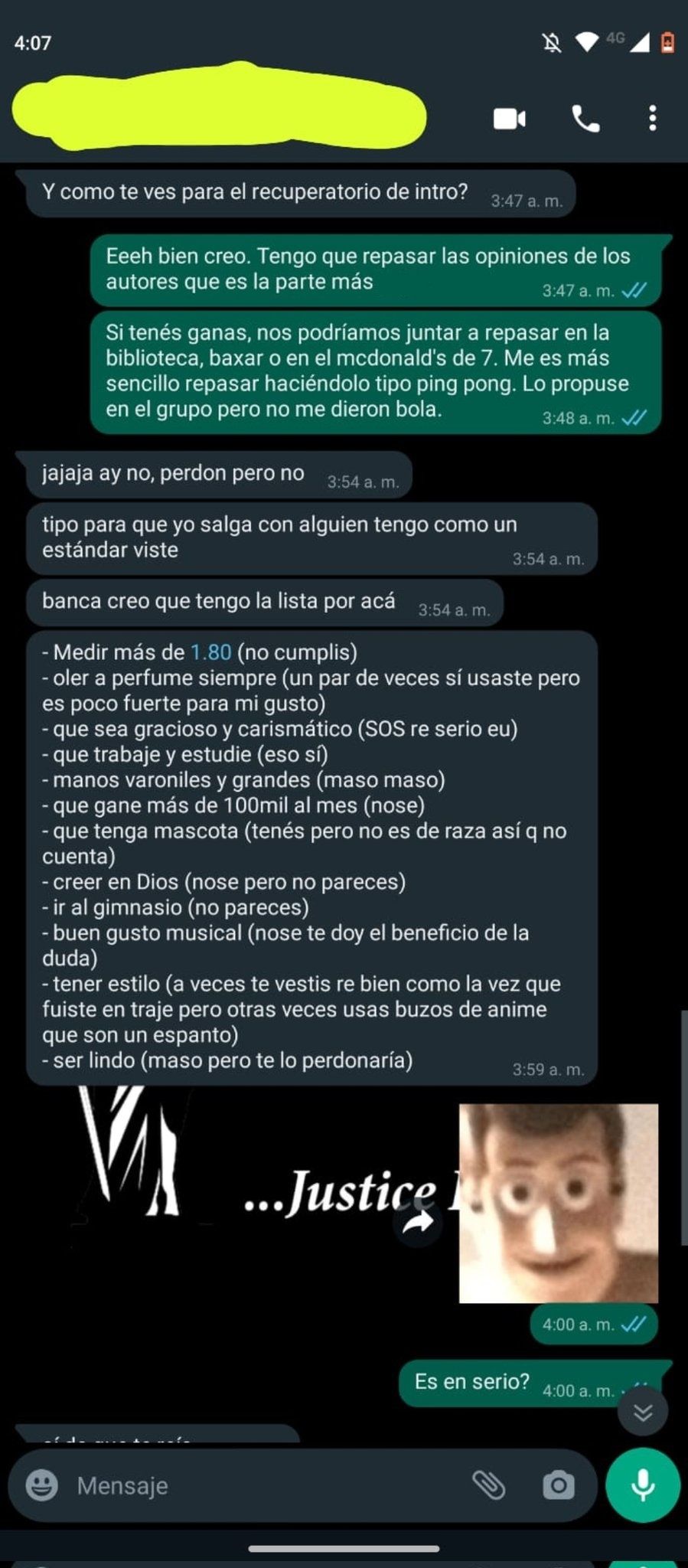 Además, incluyó un ítem que indignó al joven: "Que tenga mascota (tenés pero no es de raza, así que no cuenta)". Eso ya no fue tolerable. En primer lugar, le marcó exactamente lo que le dijo en cuanto a una potencial reunión entre ambos: "Te dije de ir a estudiar", fue la aclaración contundente y comenzaron las explicaciones.