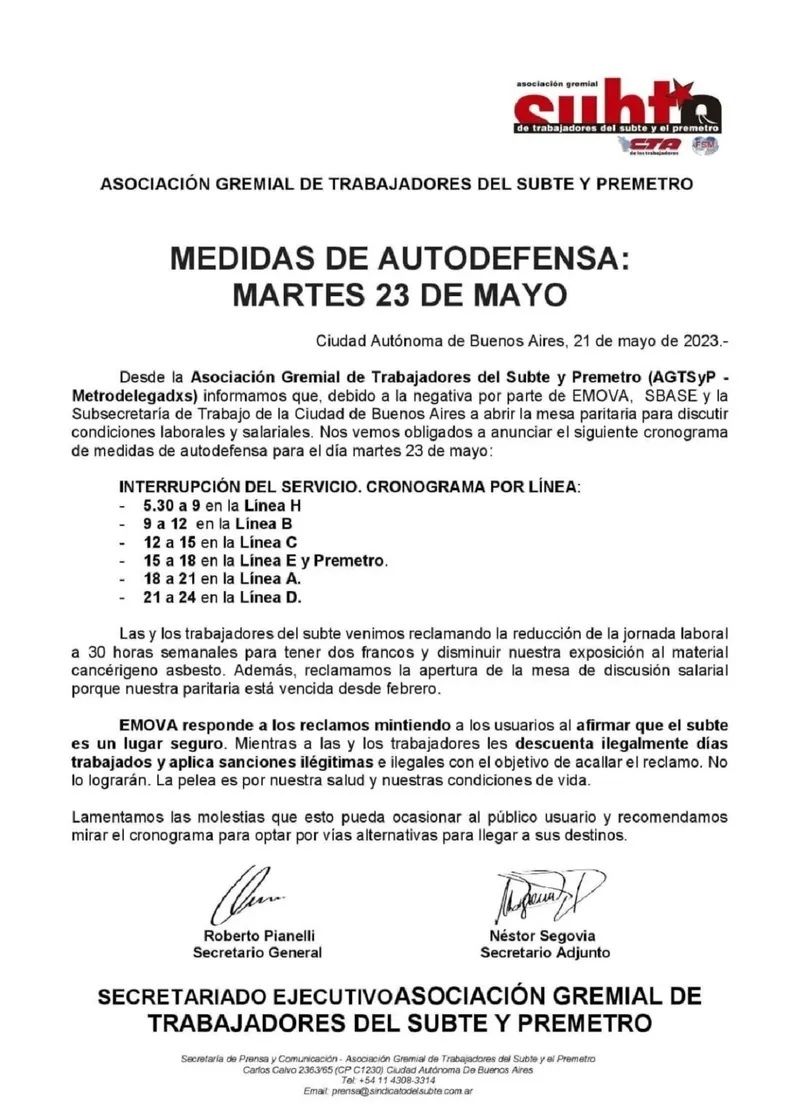 En un comunicado gremial, se anunció que las medidas se toman debido a la "negativa" de la empresa concesionaria Emova, la firma estatal Subterráneos de Buenos Aires (Sbase) y la Subsecretaría de Trabajo porteña de "abrir la mesa para discutir condiciones laborales y salariales", en la continuidad de una serie de medidas de protesta que vienen llevándose a cabo en los últimos meses.