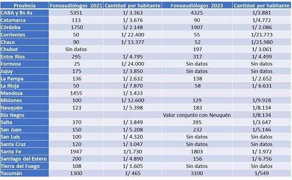 A pesar de la alta demanda, la cantidad de fonoaudiólogos en el país ha descendido notoriamente en los últimos años de acuerdo a los datos relevados por la Federación Argentina de Fonoaudiólogos, el Colegio de Fonoaudiólogos de Buenos Aires y la Asociación de Fonoaudiólogos de Buenos Aires que Maggio compiló en un cuadro para analizar el grave problema de esta realidad.