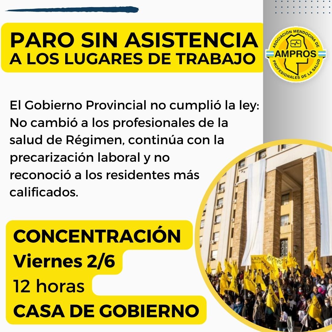 La Asociación Mendocina de Profesionales de la Salud (Ampros) anunció la realización de una movilización y paro total de actividades el próximo 2 de junio, debido al incumplimiento del Ejecutivo provincial en relación a las Leyes 7759 y 9350, como así también con los acuerdos paritarios alcanzados en el marco de las actas con fecha 29/12/2022 y 22/03/2023.