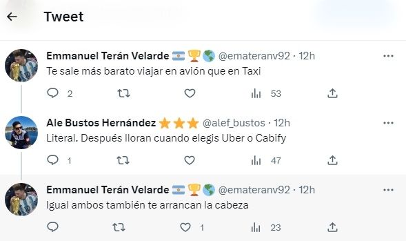 Luego, varios cibernautas comentaron el tweet mostrando su enojo por el accionar del taxista: "Te sale más barato viajar en avión que en taxi", afirmó uno de los usuarios, en clara muestra de disconformidad con la situación.