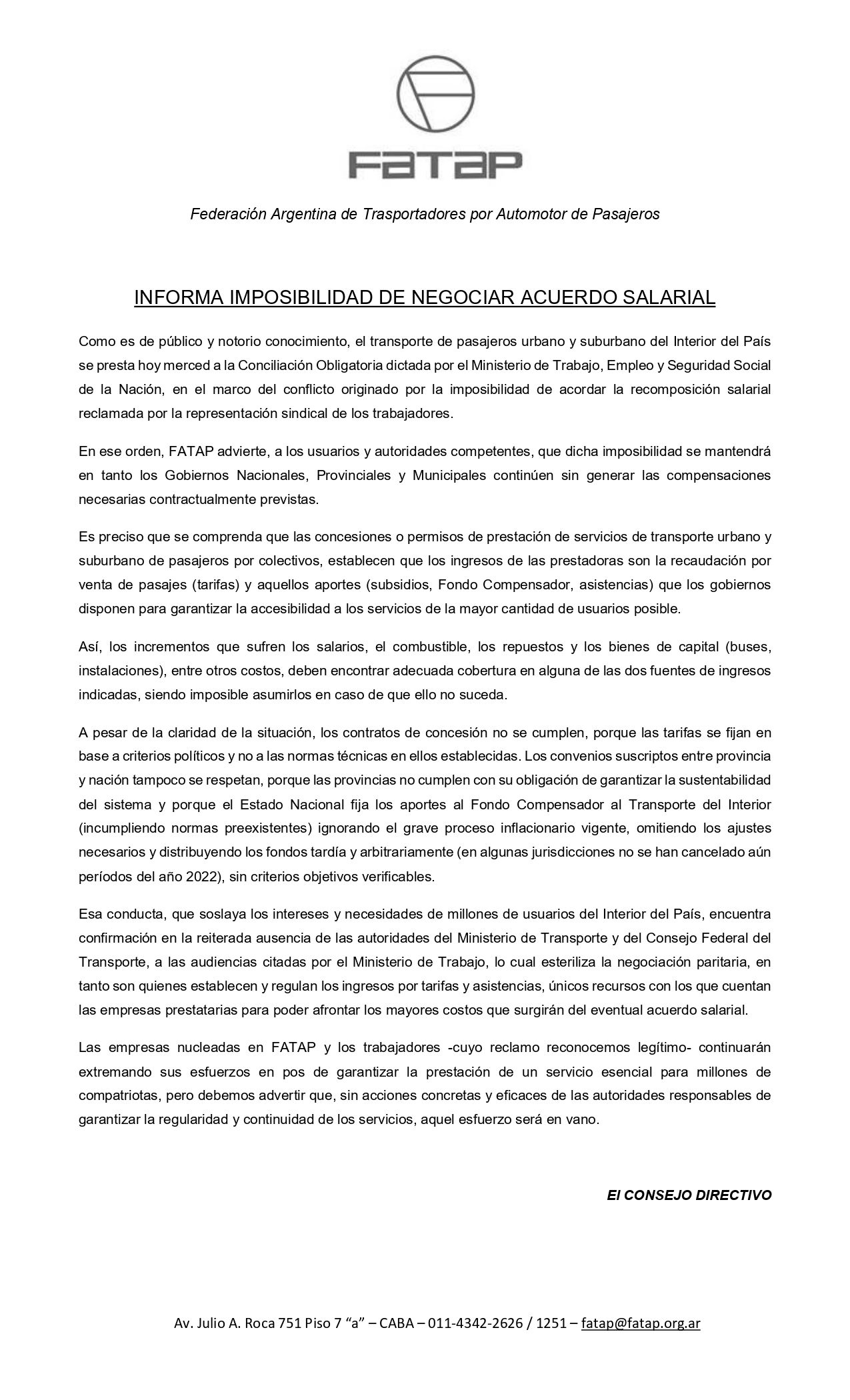 "Las empresas nucleadas en FATAP y los trabajadores continuarán extremando sus esfuerzos en pos de garantizar la prestación de un servicio esencial para millones de compatriotas, pero debemos advertir que, sin acciones concretas y eficaces de las autoridades el esfuerzo será en vano", expresó el comunicado emitido por FATAP.