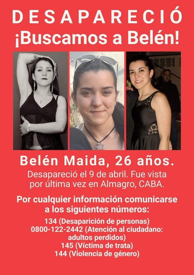 En tanto, la UNA emitió hoy un comunicado donde aclara que "sigue en la búsqueda urgente de nuestra estudiante del Departamento de Folklore, Belén Maida", ante las falsas versiones de que ya había aparecido.