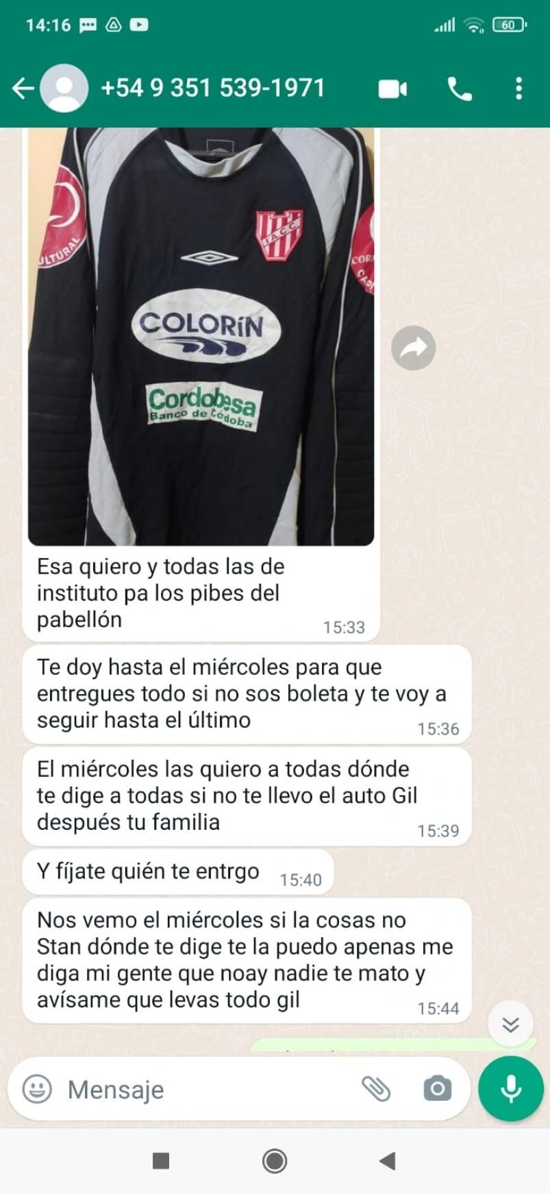 “Primero, me daban hasta el miércoles para entregarlas. El lunes, después del partido de Instituto, a los 45 minutos me dicen: ´las queremos ya, poné todo en una bolsa y llevalas´. Me dieron una ubicación en el límite de los barrios Talleres y General Bustos. Me mandaron una foto de un baldío y me explicaron que iban a dejar una reja entreabierta para que dejara allí las camisetas. Pero me advirtieron que vaya solo, que no hiciera la denuncia. En todo momento me decía: ´queremos las camisetas para los pibes del pabellón´”, detalló en declaraciones televisivas el coleccionista amenazado.