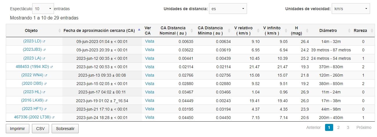 En estas páginas se pueden ver los objetos próximos a la Tierra y características como la fecha en la que rozarán el planeta, su diámetro y la distancia a la que pasará del planeta.
