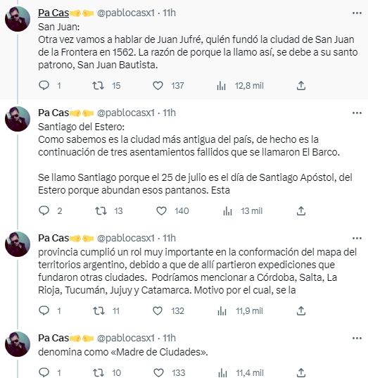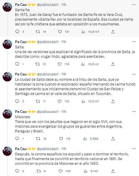Pablo Casas, el creador del hilo, decidió embarcarse en un viaje por los nombres de las provincias, explorando sus significados y orígenes. "Sabes que significa el nombre de cada una de las provincias argentinas", comentó en el inicio y agregó una reflexión:"Quizás nunca pensamos en esto, pero las provincias tienen significado propio".