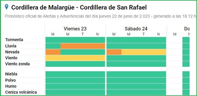 Y por vientos, con alerta amarilla se encuentras todas las zonas cordilleranas de Mendoza y Neuquén.
